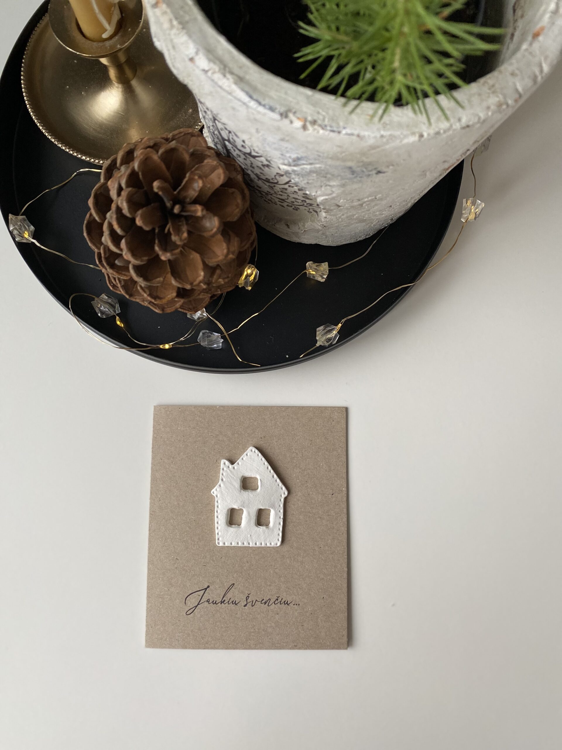 Kalėdinis atvirukas su dekoracija, pagaminta iš molio.