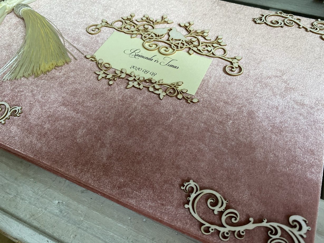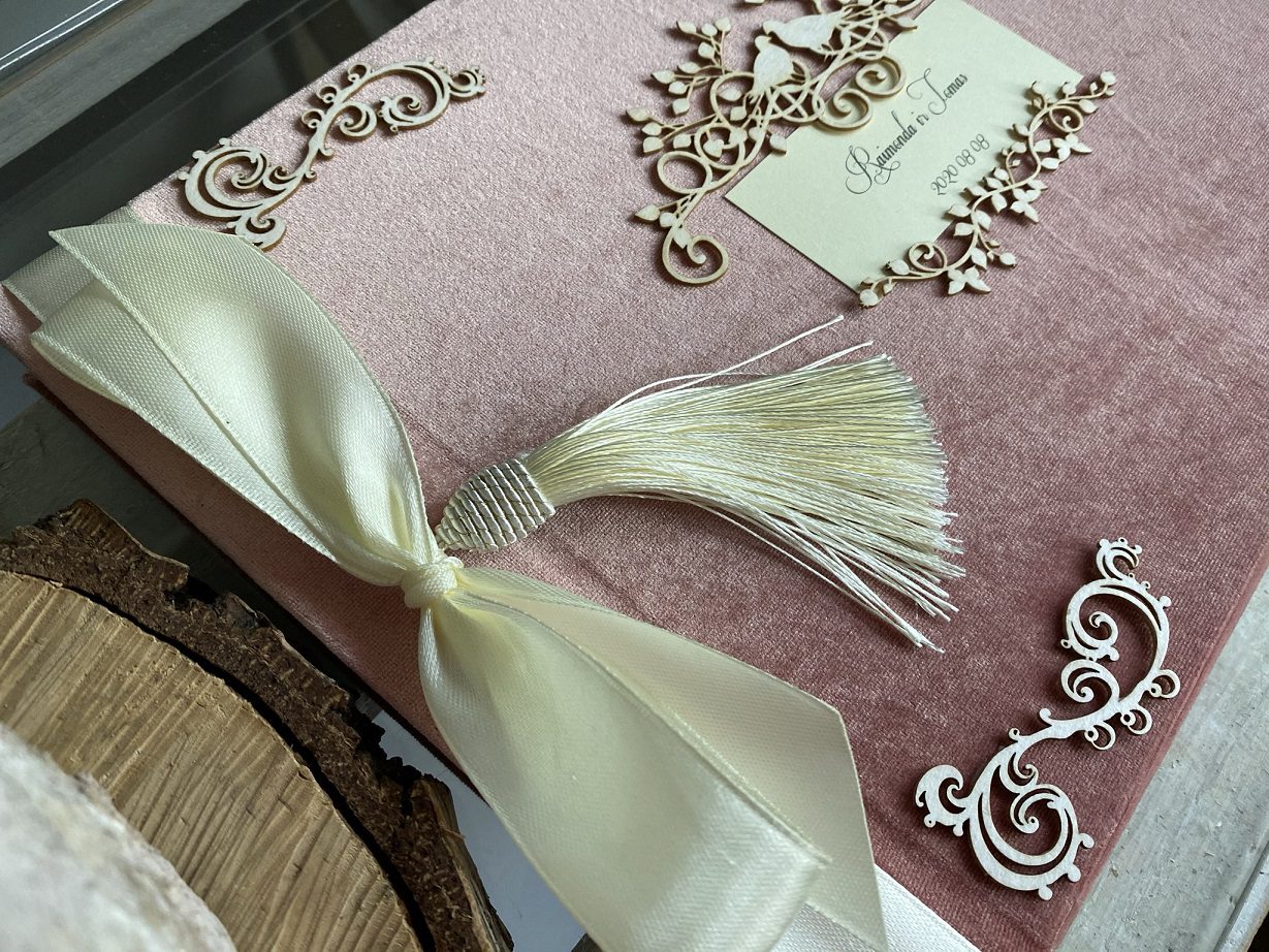Pelenų rožės aksomo svečių knyga su kartoninėmis formelėmis, kaspinu per šoną su kutu.