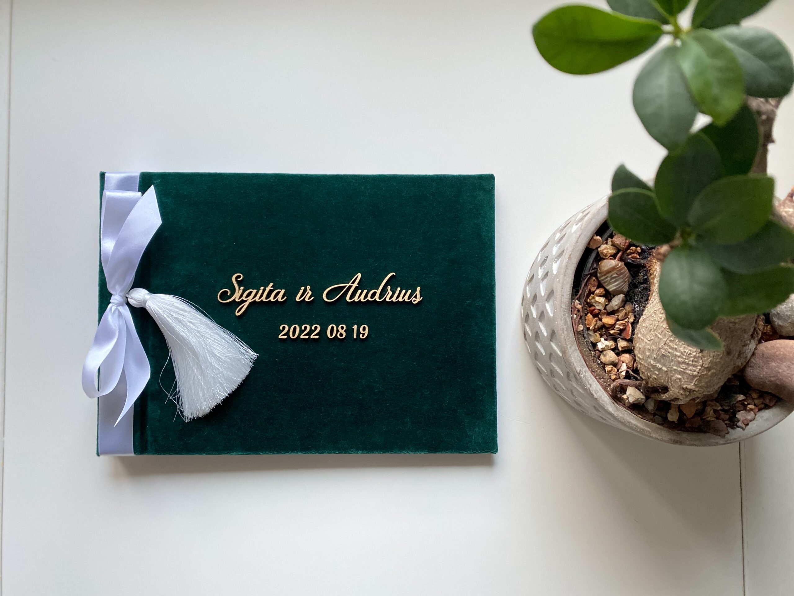 - Audinys: palinkėjimų knygos viršelis aptrauktas veliūru (veliūro spalva nuotraukoje: žalia).