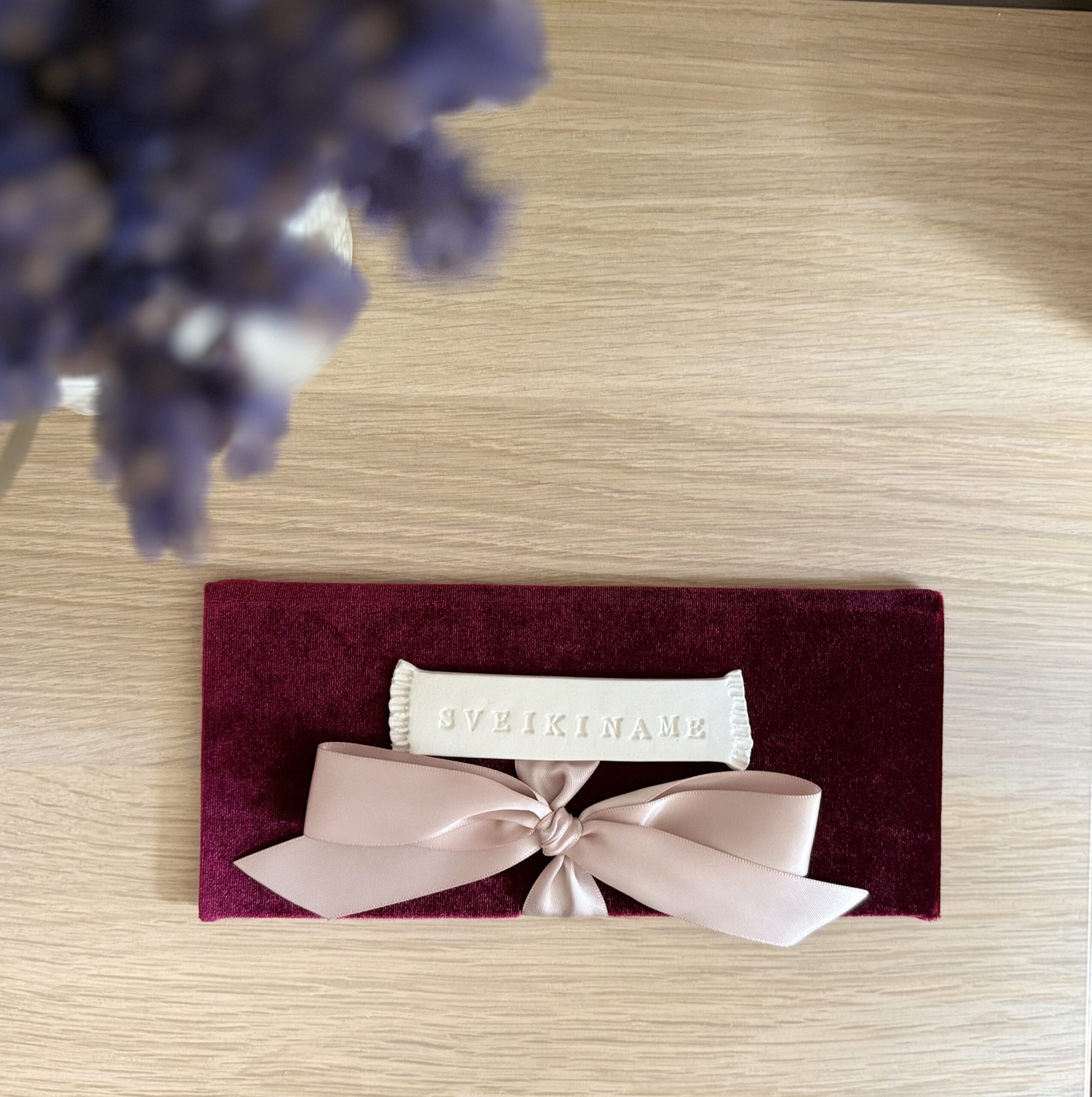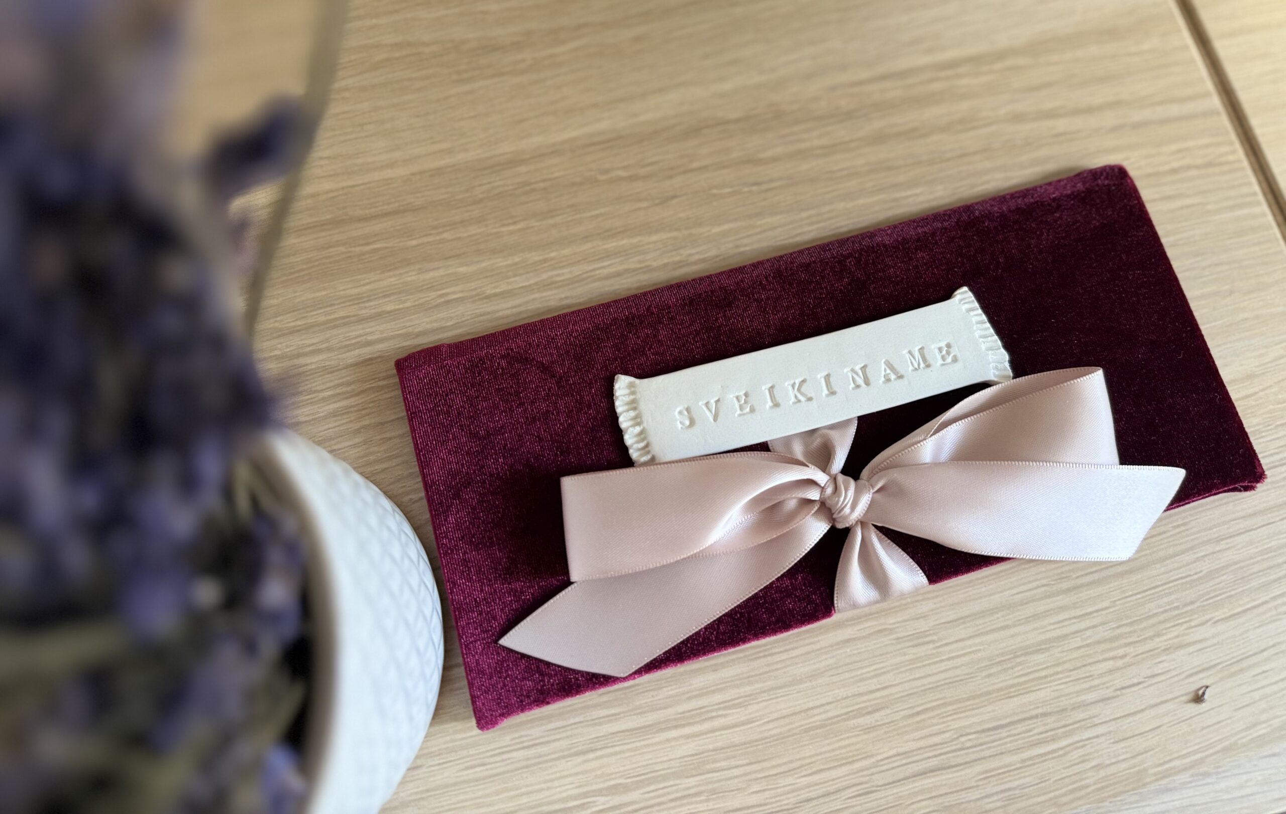- Dekoras: užrašas “SVEIKINAME” iš ore džiūstančio molio, surištas kaspinu.
