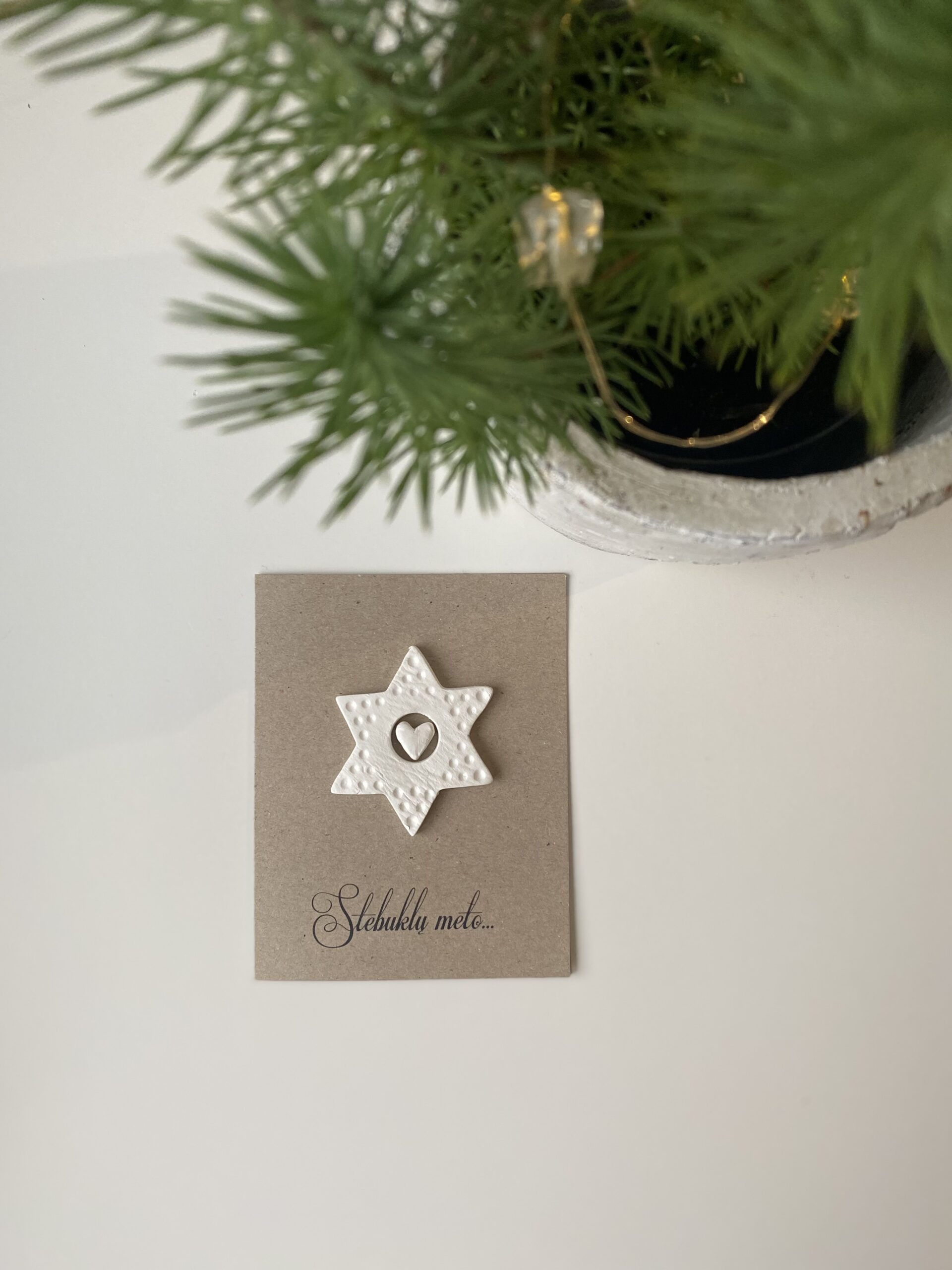 Kalėdų atvirutė pagaminta iš storo kraft popieriaus, dekoruota žvaigždute, pagaminta iš molio.